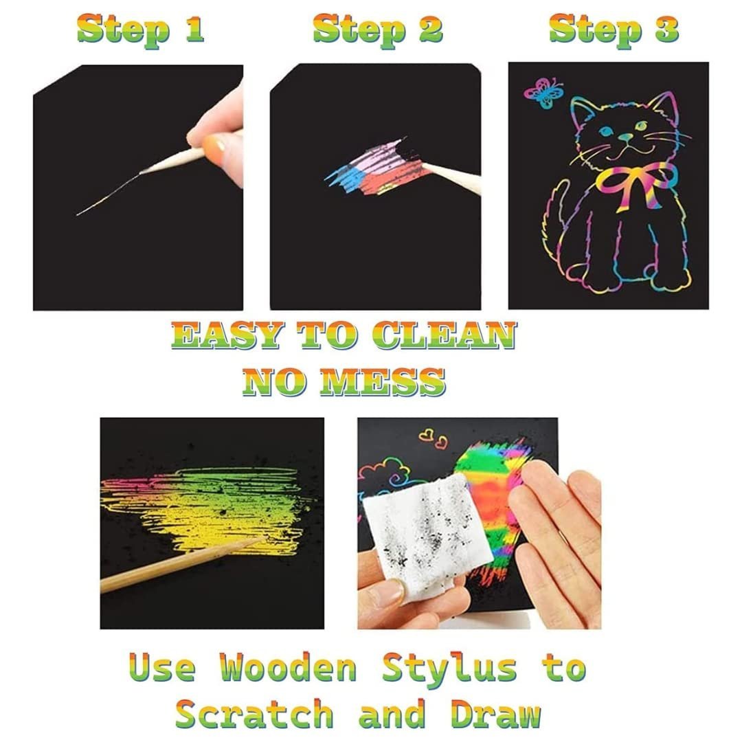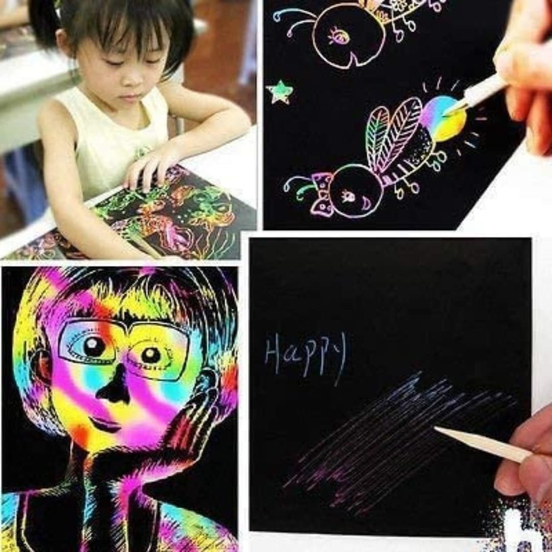 How to use: Simply scribble or doodle using a wooden stylus on the black sheet to reveal magical colors hidden beneath. Get inspired or create your imaginative illustrations on the sheet.