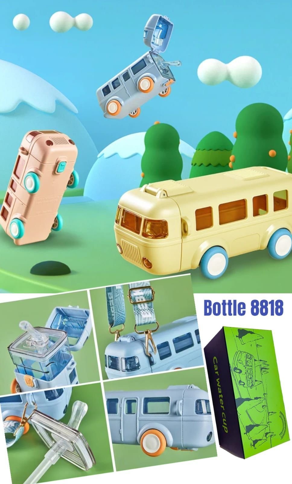 Bus Bus-shaped FULLKART Water Bottle is perfect for your daily drinking water. The water bottle comes with with Moving Wheels, Strap & Sipper.